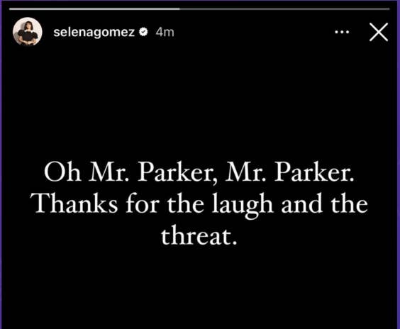 Gomez then posted to her Instagram story, “Oh Mr. Parker, Mr. Parker. Thanks for the laugh and the threat.”
