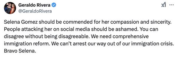 “Selena Gomez should be commended for her compassion and sincerity… We need comprehensive immigration reform. We can’t just arrest our way out of our immigration crisis,” said former Fox News host Geraldo Rivera.